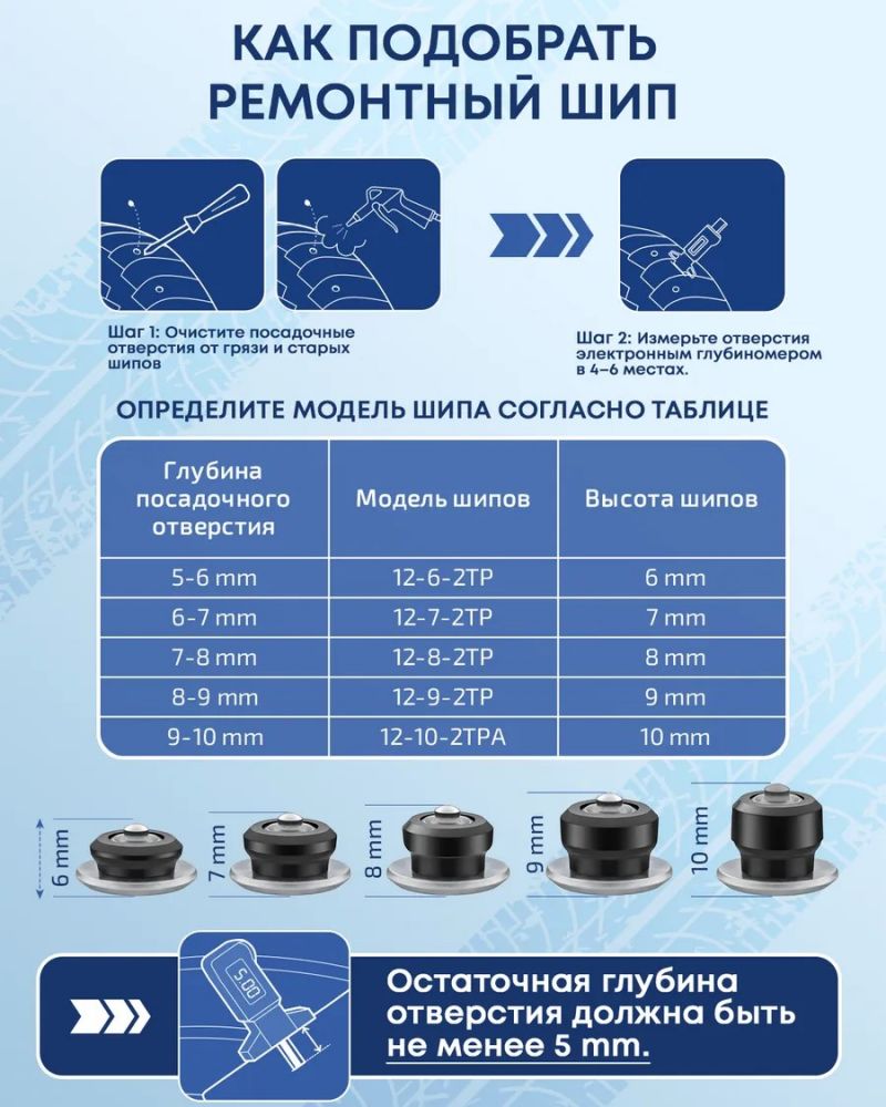глубина отверстия под шип в протекторе шины - от 5 до 6 мм.